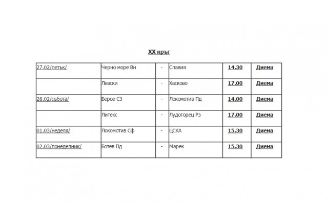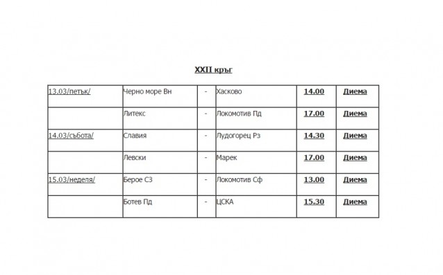 Мачът между Лудогорец и Левски от 21-я кръг е на 8-и март от 15.30 часа, а преди това на 1-и март ще се изиграе столичното дерби между Локо Сф и ЦСКА от 15.30 часа.