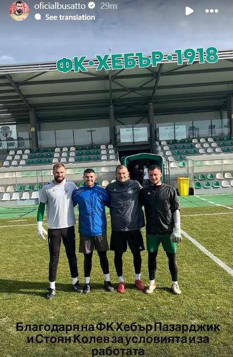Чужденецът с най-много мачове за ЦСКА - Густаво Бусато, бързо си намери отбор, с който да поддържа спортна форма. Бразилецът пусна снимка в социалните мрежи от стадион "Георги Бенковски" в Пазараджик, облечен с фланелка на Хебър и в компанията на двамата вратари на пазарджликлии и с техния треньор Стоян Колев.