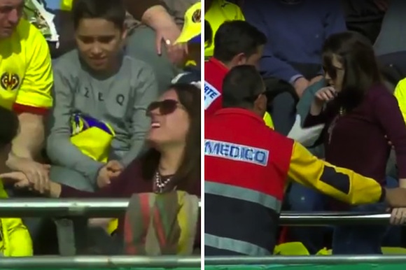 Един от топовните шутове на Меси прати топката в млада жена на тибуните. Тя спря топката с ръка. В Испания уловиха момента и силната болка, която видимо изпитва дамата.
