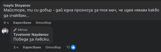 Финансовият благодател на ЦСКА 1948 Цветомир Найденов направи прогноза във "Фейсбук", че Левски ще стигне до победата в голямото дерби с ЦСКА. Той попитан, кой ще спечели двубоя между"червените" и "сините" от фен. "Победа за Левски", отговори предприемачът.